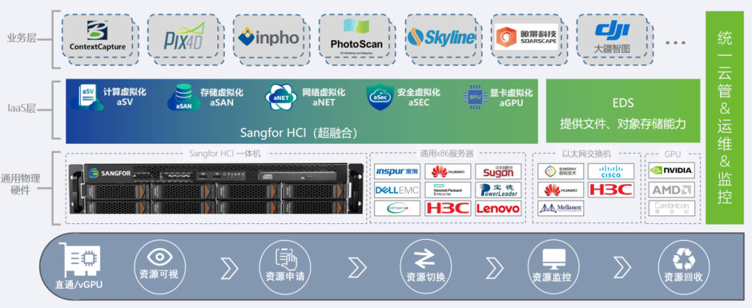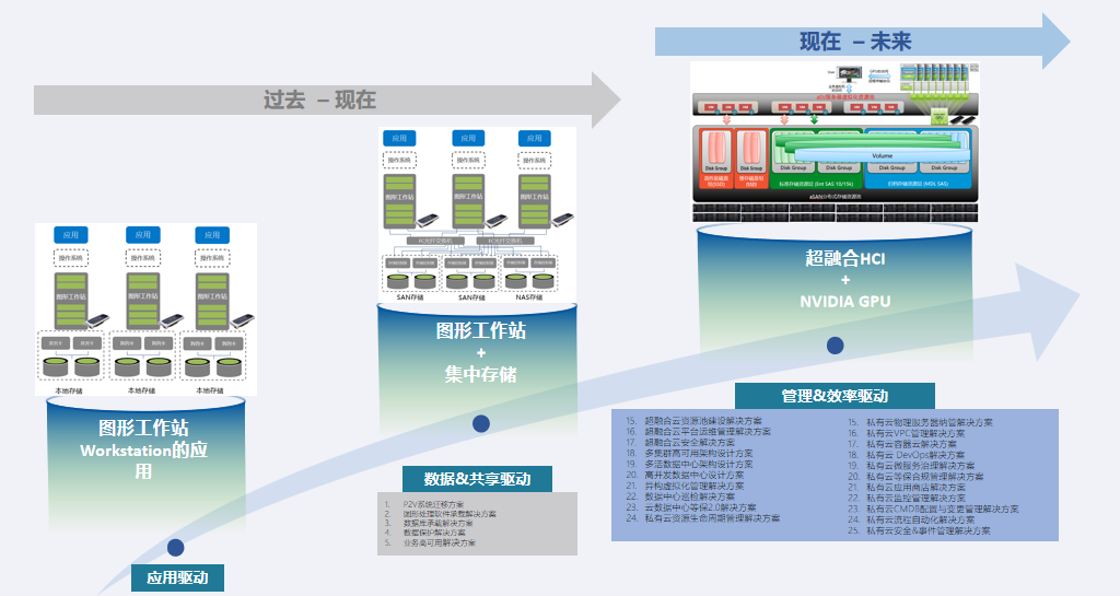 测绘行业还处在传统IT架构的桎梏中,过去是以应用驱动的独立图形工作站组成的生产环境,业务割裂,运维困难;现在逐渐发展成为以数据和共享驱动的图形工作站+集中式存储的模式,一定程度上解决了业务割裂的问题,但受限于存储网络等瓶颈,生产效率仍然低下。信服云针对这些痛点,提出未来的测绘行业IT架构应该是以管理和效率驱动的超融合+GPU资源池化+分布式存储的模式,而且该模式还可以采用逐步云化的方式演进完成。