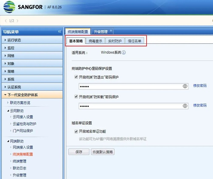 无需另外占用服务器资源安装终端管理平台,通过下一代防火墙自带终端管理平台的极简部署模式,在下一代防火墙单台设备上即可完成网端防护策略、网端安全问题处置、安全统一分析展示,轻松完成安全运维管理。